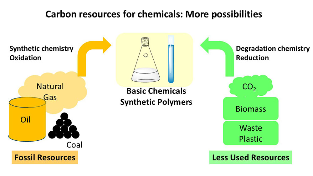 当研究室では、二酸化炭素や非可食バイオマス、廃プラスチックなど、未だ十分に活用されていない炭素資源の有効利用を可能にするため、触媒・高分子分野に非線形のブレークスルーを生み出し、地球規模の環境問題の解決に資する重要な基礎・応用研究を進めます。特に、二酸化炭素とオレフィン類を原料とした高分子の合成法や、バイオマスや廃プラスチックの資源化に向けた脱酸素化反応を均一/不均一、双方の触媒に基づき開発しています。さらにその反応機構を明らかとすることで、液相/固相の別にとらわれない統一的な触媒設計理論を構築することを目標としています。